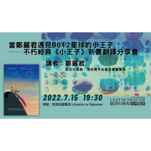 前文化部長鄭麗君將在這次的聚會中,跟大家聊聊《小王子》這部雋永經典的時代性與當代感知,以及在她人生不同階段閱讀《小王子》所受到的啟發;也將分享作為一個翻譯新手,她為什麼會決定踏上這一趟意外而豐富的翻譯旅程,還有在這趟驚奇之旅中意外發現,埋藏在字句裡面,甚至是章節與章節之間,那些看不見的小祕密。 -