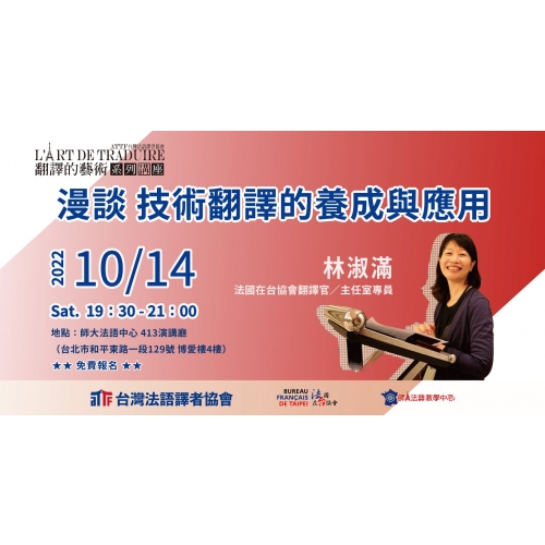 10月14日週五晚上7:30,我們邀請到法國在台協會翻譯官/主任室專員林淑滿,她將與大家分享她所經歷各種性質的翻譯工作經驗談和箇中門道。