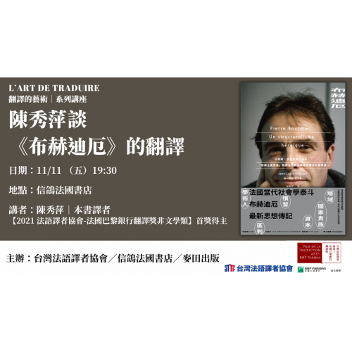 陳秀萍談《布赫迪厄》的翻譯—2021【台灣法語譯者協會-法國巴黎銀行翻譯獎】非文學類首獎得主講座陳秀萍談《布赫迪厄》的翻譯—2021【台灣法語譯者協會-法國巴黎銀行翻譯獎】非文學類首獎得主講座 -