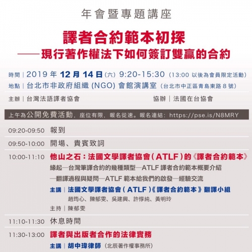 2019年台灣法語譯者協會年會暨專題講座於12月14日上午在臺北市非政府組織(NGO)會館舉行,以「法國文學譯者協會(ATLF)《譯者合約範本》」和「譯者與出版者合作的法律實務」,以展開今天的專題探討。