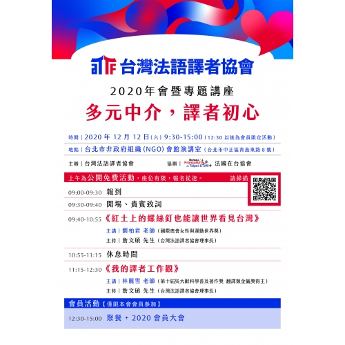 2020年台灣法語譯者協會年會暨專題講座於12月12日上午在臺北市非政府組織(NGO)會館舉行,以「多元中介,譯者初心 」,以展開今天的專題探討。