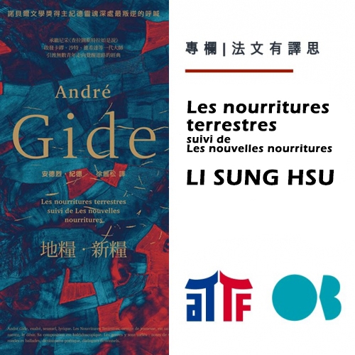 法文有譯思》在一段時間中把它的顏色借給了你:紀德《地糧》翻譯拾遺「台灣製造」的正體中文新譯版《地糧》,在安德烈.紀德(André Gide)誕生一個半世紀後翩然降臨,澆灌文學的豐美麥田。這部作品是紀德在旅行北非和義大利後,於1897年出版的一部青春回憶錄,作品彷彿在採擷散落人間的豐美糧餉,以長篇散文詩的形式,禮讚生命與自然、歌頌慾望與愛,儼然是洋溢喜悅與激情的泛神主義快樂頌。 -