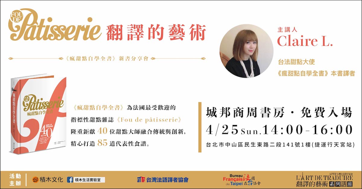 本場活動將由新一代推動法式甜點台法交流的甜點大使Claire L.主講,除了分享書中重量級的甜點大師與甜點之外,更是獨家分享Claire L.翻譯這本甜點聖經《Fou de pâtisserie瘋甜點自學全書》的歷程,以及翻譯工作的門道與藝術。
