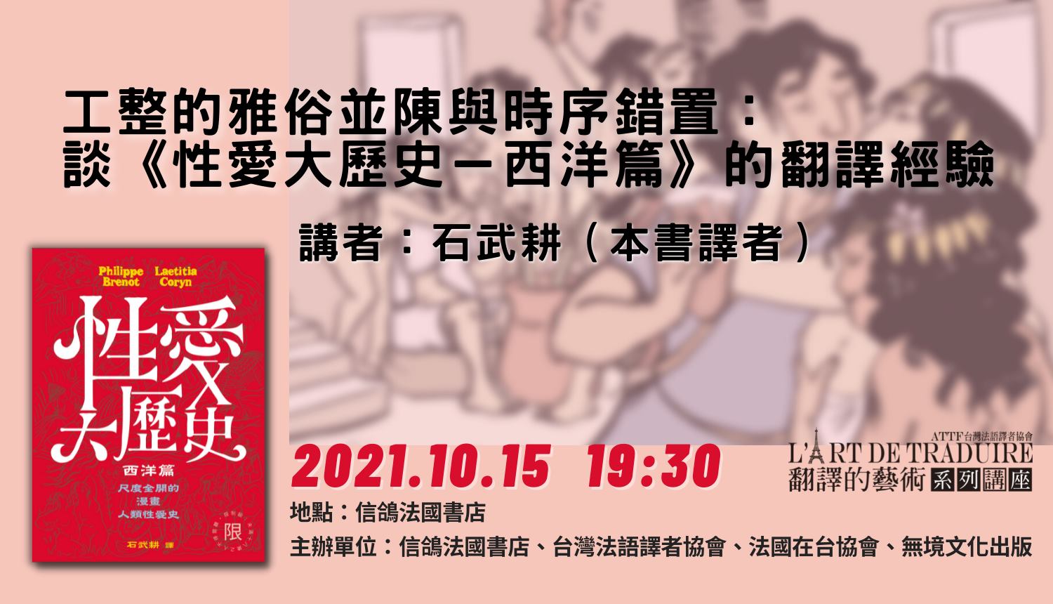 《性愛大歷史-西洋篇》是本輕鬆傳遞知識的漫畫:短短一句話裡,就出現了輕鬆、知識、漫畫這三個關鍵詞。既以輕鬆吸收為目標,就要追求通順自然;既以傳遞知識為使命,就要優先保障忠實。換言之,猶如濃縮了翻譯工作本質上的矛盾──幸而還有圖畫的輔助,使文字不必孤軍奮戰。從結構上來看,亦莊亦諧、寓教於樂的作品,也就是功能相異的部件彼此交錯並陳的複調文本。對於譯者而言,則表示要在不同的欄位切換成相應的言詞風格與取捨考量,以貼近理想中的對等效果。 無論對翻譯、法語、漫畫、普及歷史、下流哏還是性器官有興趣,都歡迎來聊一聊。
