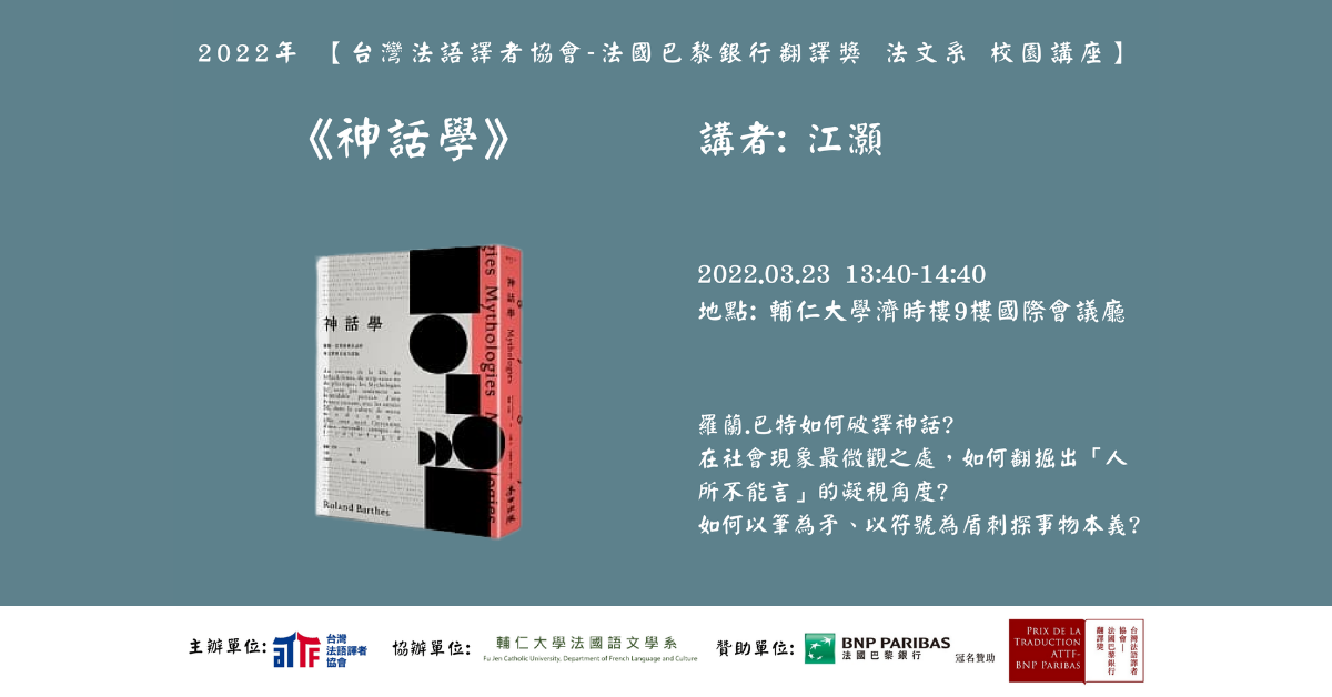 2 0 2 2年 【台灣法語譯者協會-法國巴黎銀行翻譯獎 法文系 校園講座】-「從人造黃油到鋼鐵人飛行裝,神話,遍地開花——羅蘭.巴特的社會書寫與微觀技藝」
