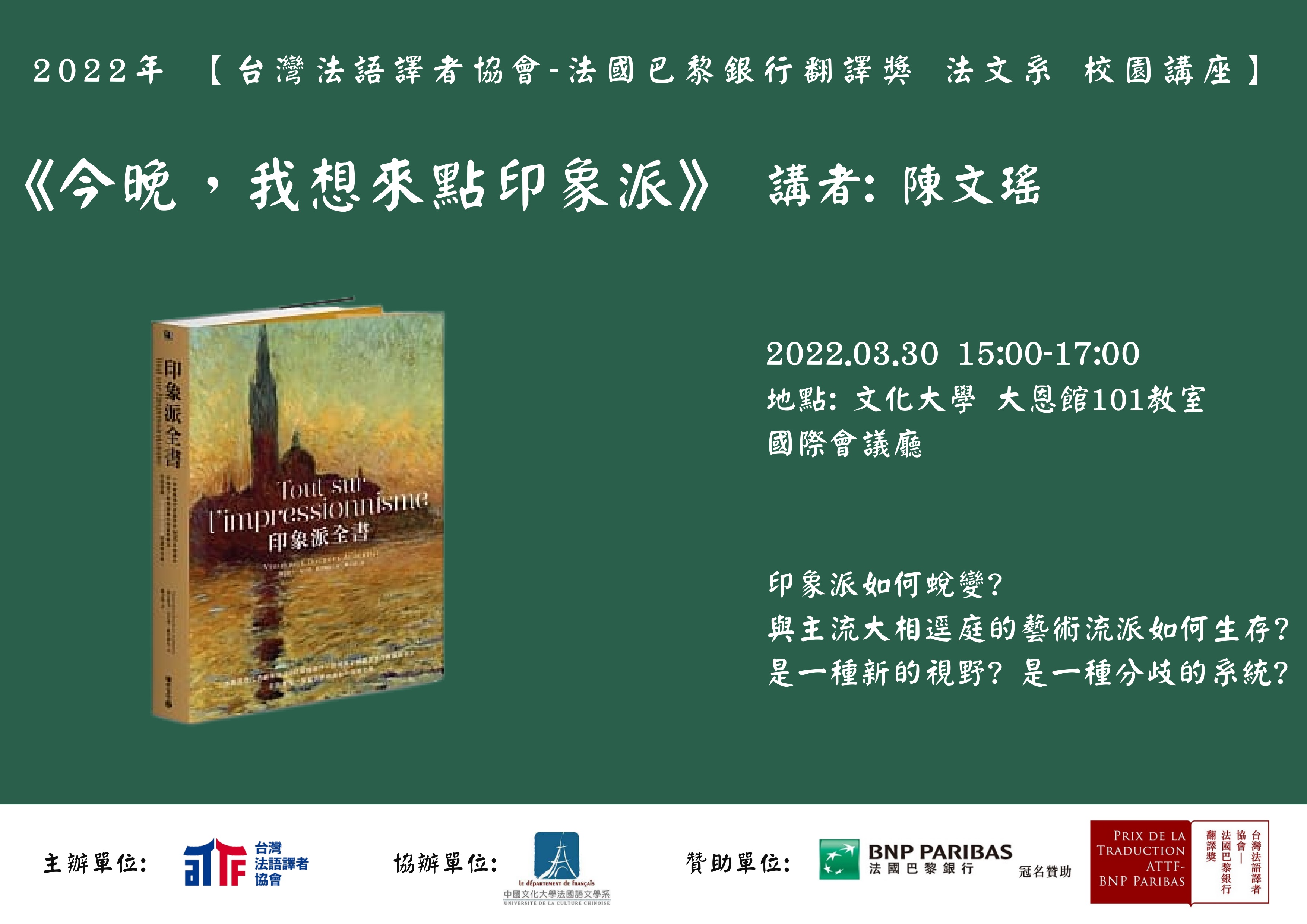 2 0 2 2年 【台灣法語譯者協會-法國巴黎銀行翻譯獎 法文系 校園講座】-《今晚,我想來點印象派》
