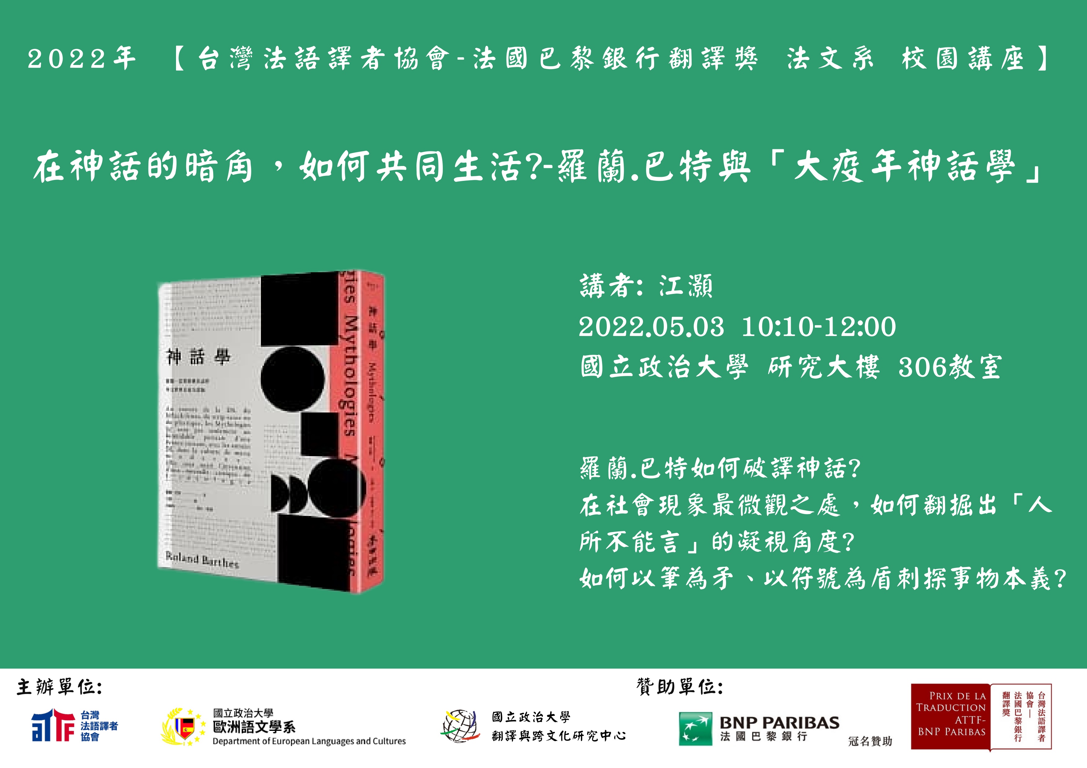 2 0 2 2年 【台灣法語譯者協會-法國巴黎銀行翻譯獎 法文系 校園講座】-在神話的暗角,如何共同生活?-羅蘭.巴特與「大疫年神話學」