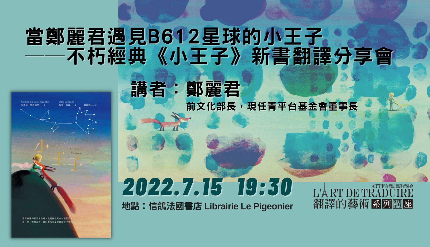 前文化部長鄭麗君將在這次的聚會中,跟大家聊聊《小王子》這部雋永經典的時代性與當代感知,以及在她人生不同階段閱讀《小王子》所受到的啟發;也將分享作為一個翻譯新手,她為什麼會決定踏上這一趟意外而豐富的翻譯旅程,還有在這趟驚奇之旅中意外發現,埋藏在字句裡面,甚至是章節與章節之間,那些看不見的小祕密。