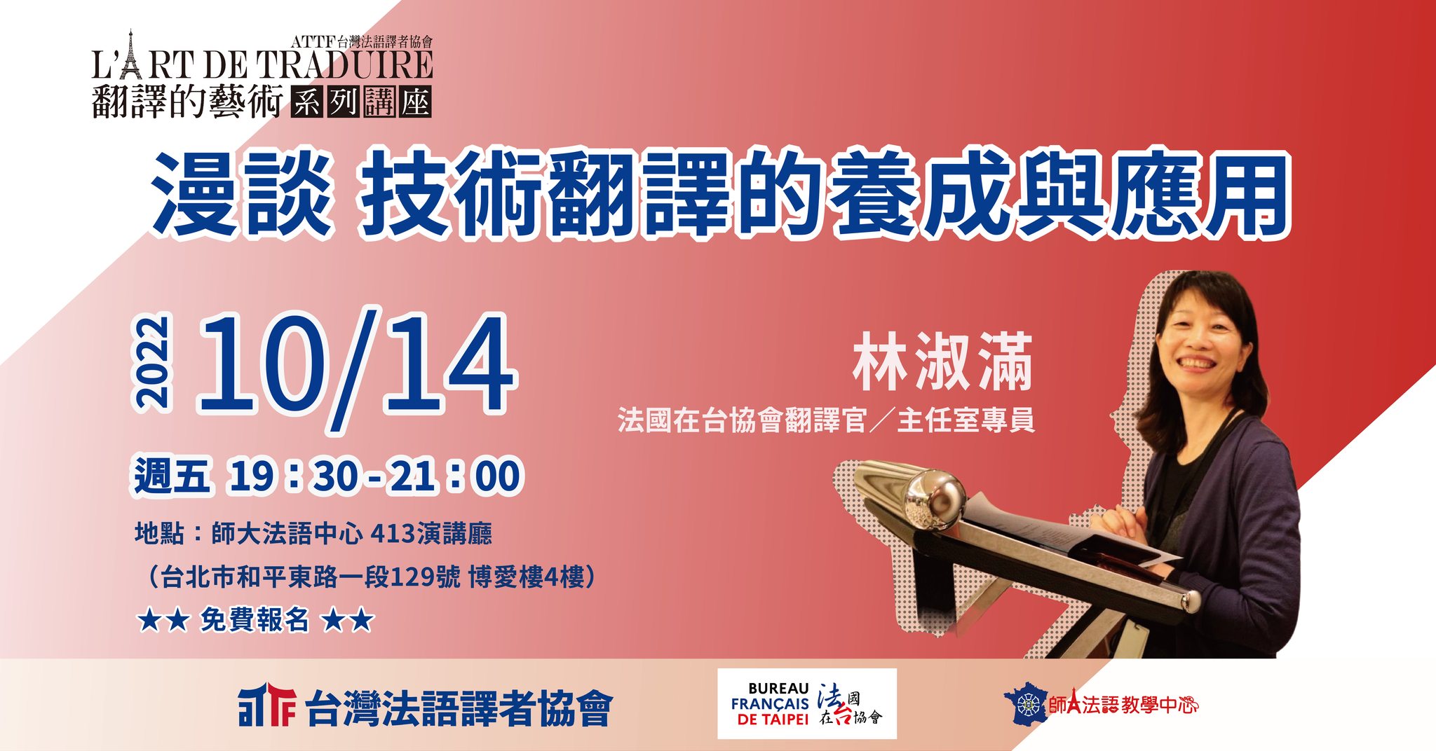我們邀請到法國在台協會翻譯官/主任室專員林淑滿,與大家分享她所經歷各種性質的翻譯工作經驗談和箇中門道。