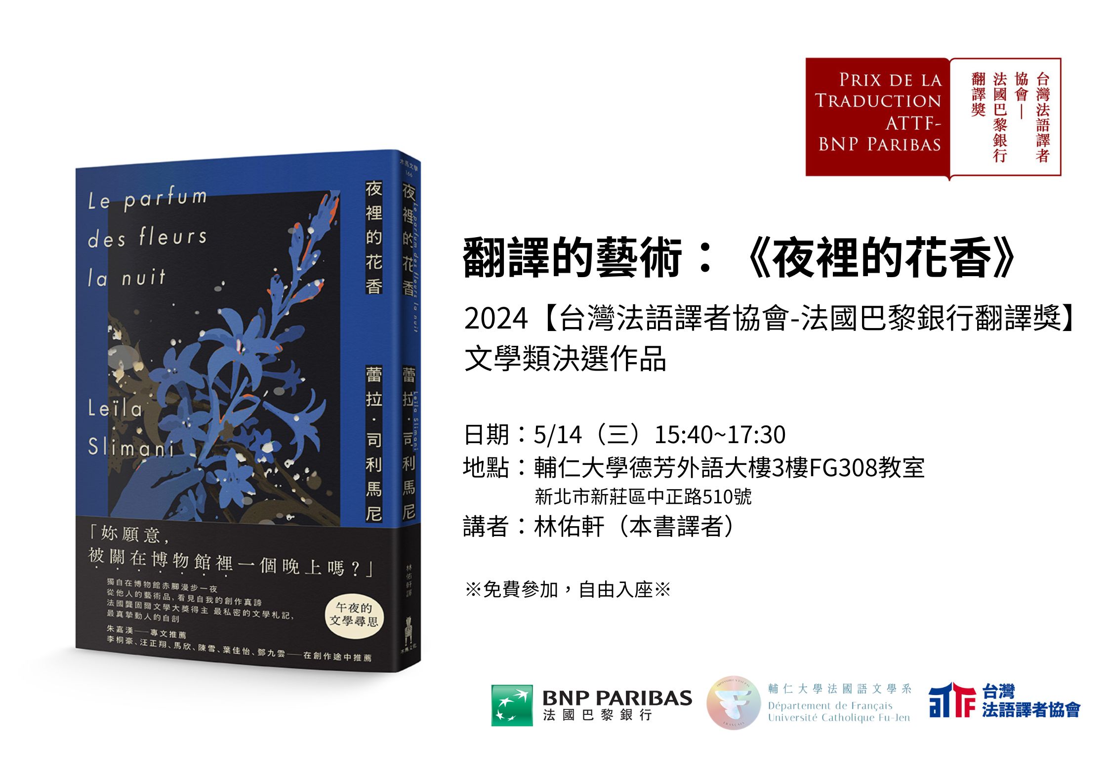 翻譯獎校園講座:《夜裡的花香》2024【台灣法語譯者協會-法國巴黎銀行翻譯獎】文學類決選作品活動紀錄