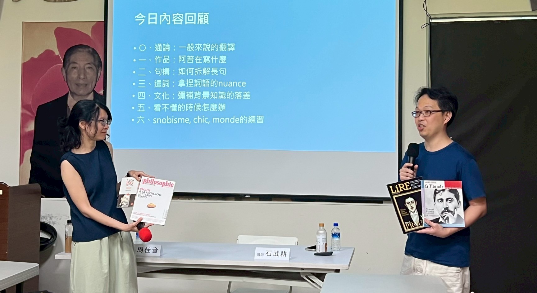 講座除了分享跟普魯斯特(暱稱阿普)相知相惜的過程,讓大家重新看待《追憶似水年華》這部巨作。好好欣賞阿普用清楚的方式去描寫模糊的意識,在悖論裡行走。處理阿普各式各樣的困難,例如要努力彌補背景知識的落差,細碎又龐大、密實又冗長,過份詳盡的描述與對白⋯⋯