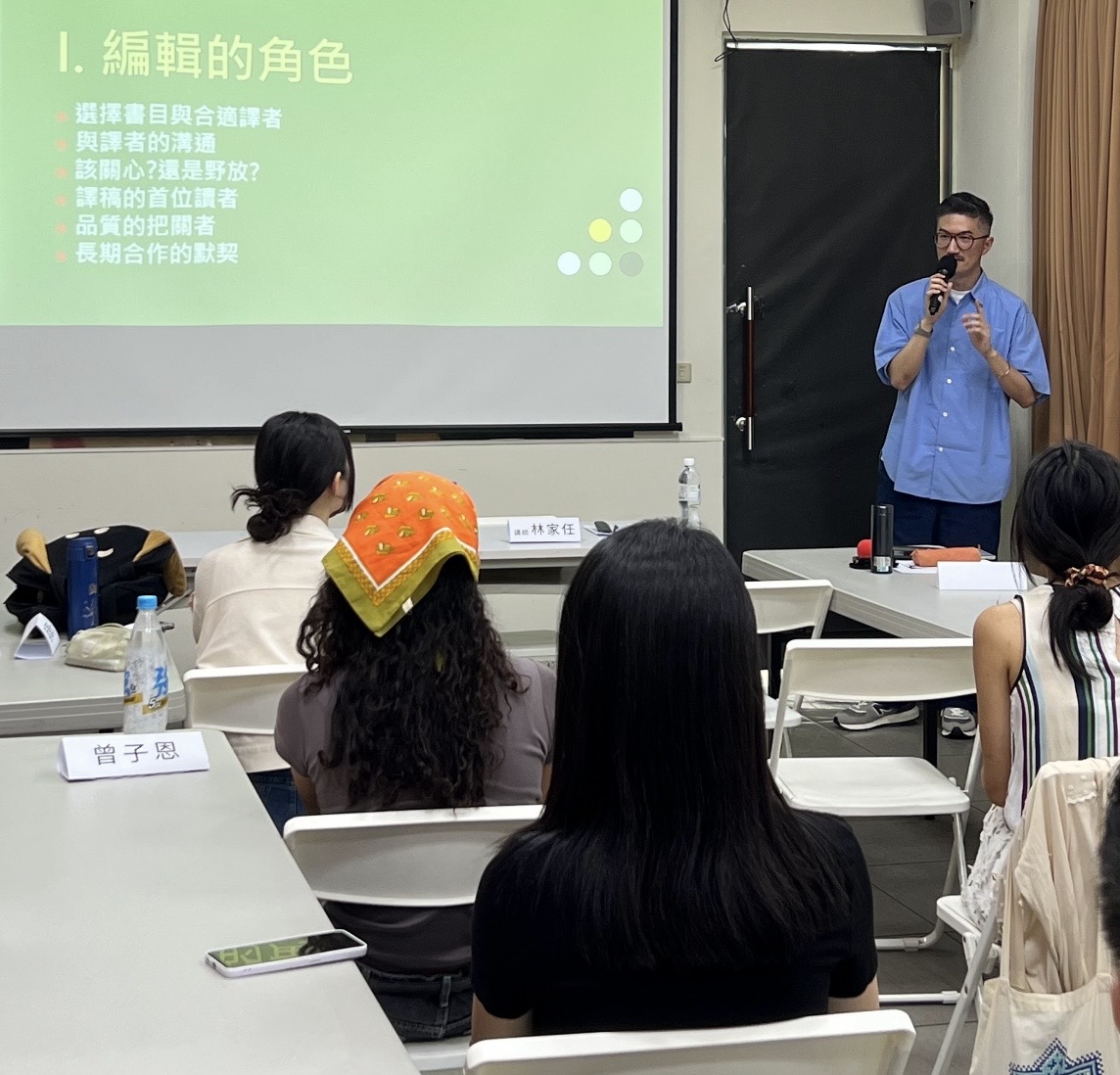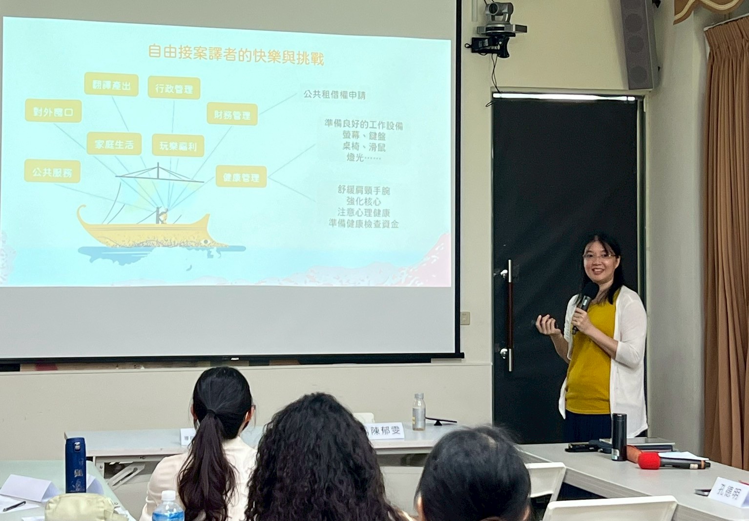 當個快樂的自由接案譯者也有很多面向要注意,除了武耕老師說的維持每週出門見見人類,好的設備也能預防專職譯者的職業傷害。自律的生活作息,生活平衡得以持續地前行。最後,「磨出你心中的一把尺,找到屬於你的地方」是郁雯老師送給大家的話。