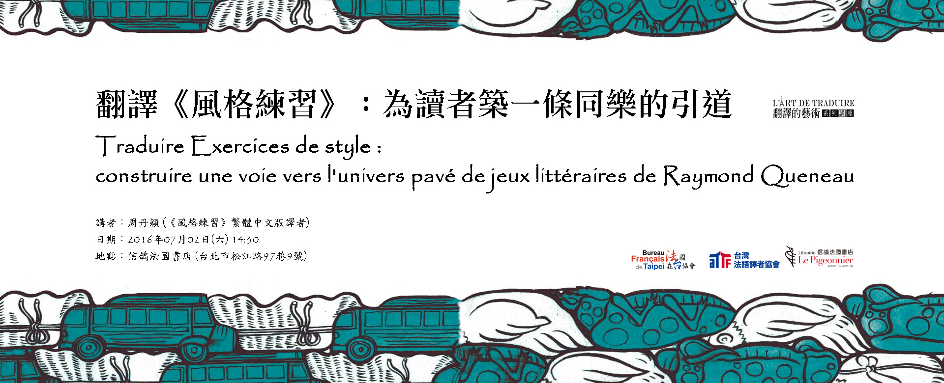 傳說 Exercices de style 《風格練習》(1947),是本不可(盡)譯的書。雷蒙.格諾(Raymond Queneau)以九十九種不同形式,重複書寫在S線公車上發生的一起小事件及後續插曲。故事本身不足為奇,奇特的是作者萬花筒般令人眩目的創意與知識:格諾戲擬既存的修辭法、文體、文學風格以及各種行話、術語,又在烏力波式的「限制」實驗以外,藉由口語表達和一語雙關,大玩文字遊戲,讓會意的讀者狂笑不止。因而某些深入法國文化和法語肌理的練習,「不可譯」的名聲也不脛而走。向來對世上各種限制與界線抱持「先衝了再說」之盲(白)目心態的譯者周丹穎,站在雙語的交叉口上,接下了挑戰。面對九十九則不時讓她踢到鐵板的練習,她如何想方設法,為中文讀者築出一條跨越語界的引道?《風格練習》的中譯實例,是否也在歡樂的汗(淚)水中,稍為「文學翻譯」的當代定義鬆了綁?